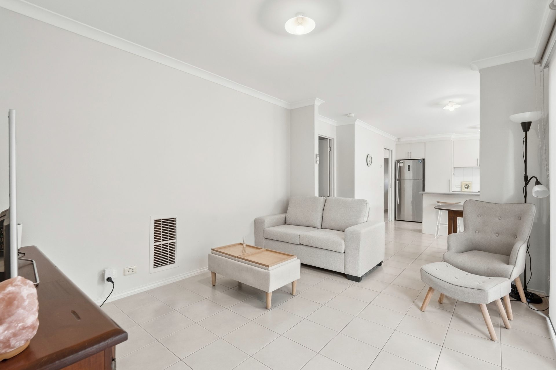 The intelligent floorplan offers a private master suite complete with walk-in robe and ensuite, while two additional bedrooms feature built-in robes and are serviced by a central bathroom. The well-appointed kitchen forms the heart of the home, showcasing modern appliances, generous bench space, and ample storage, flowing seamlessly into the open-plan living and dining areas.