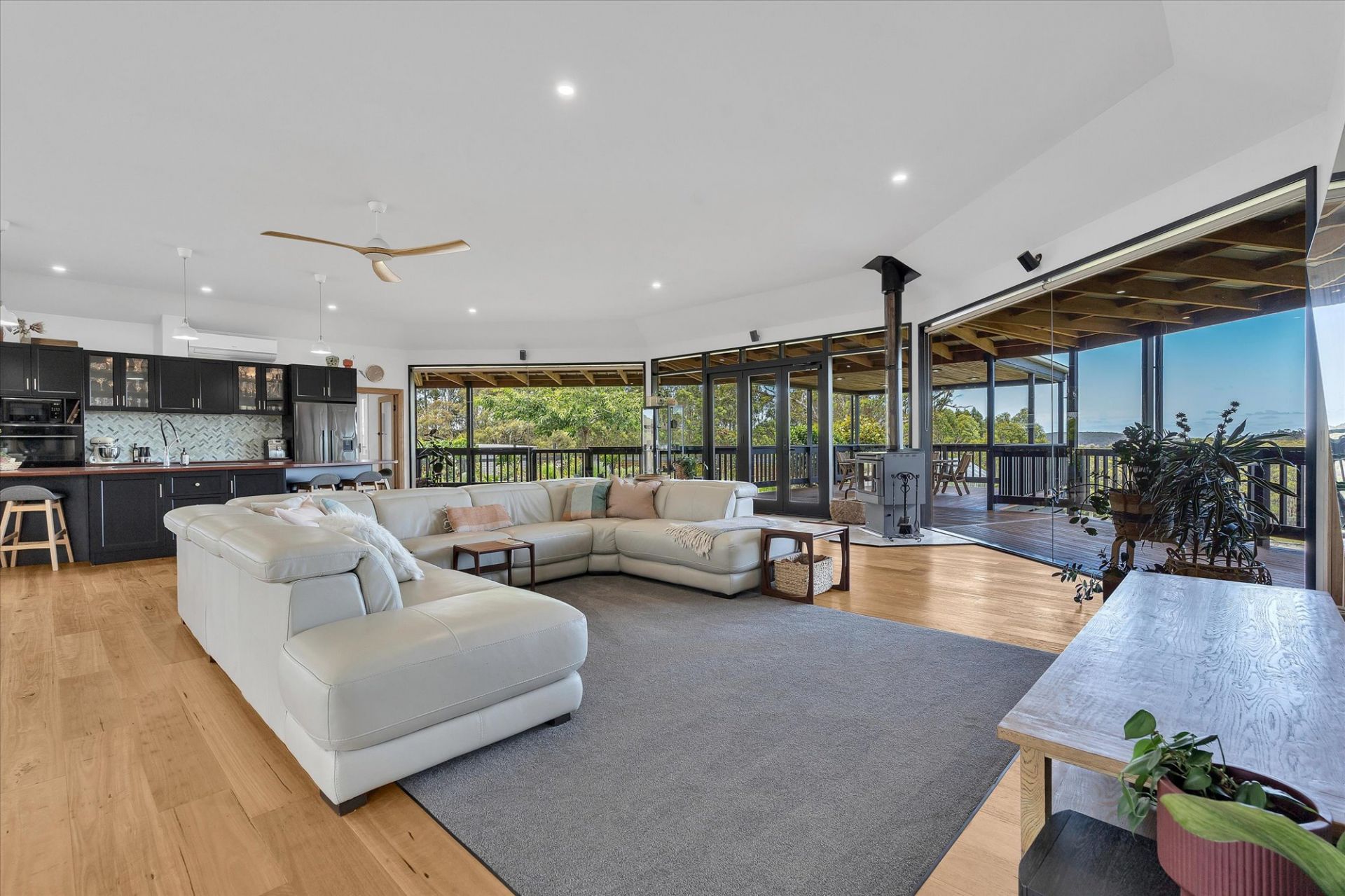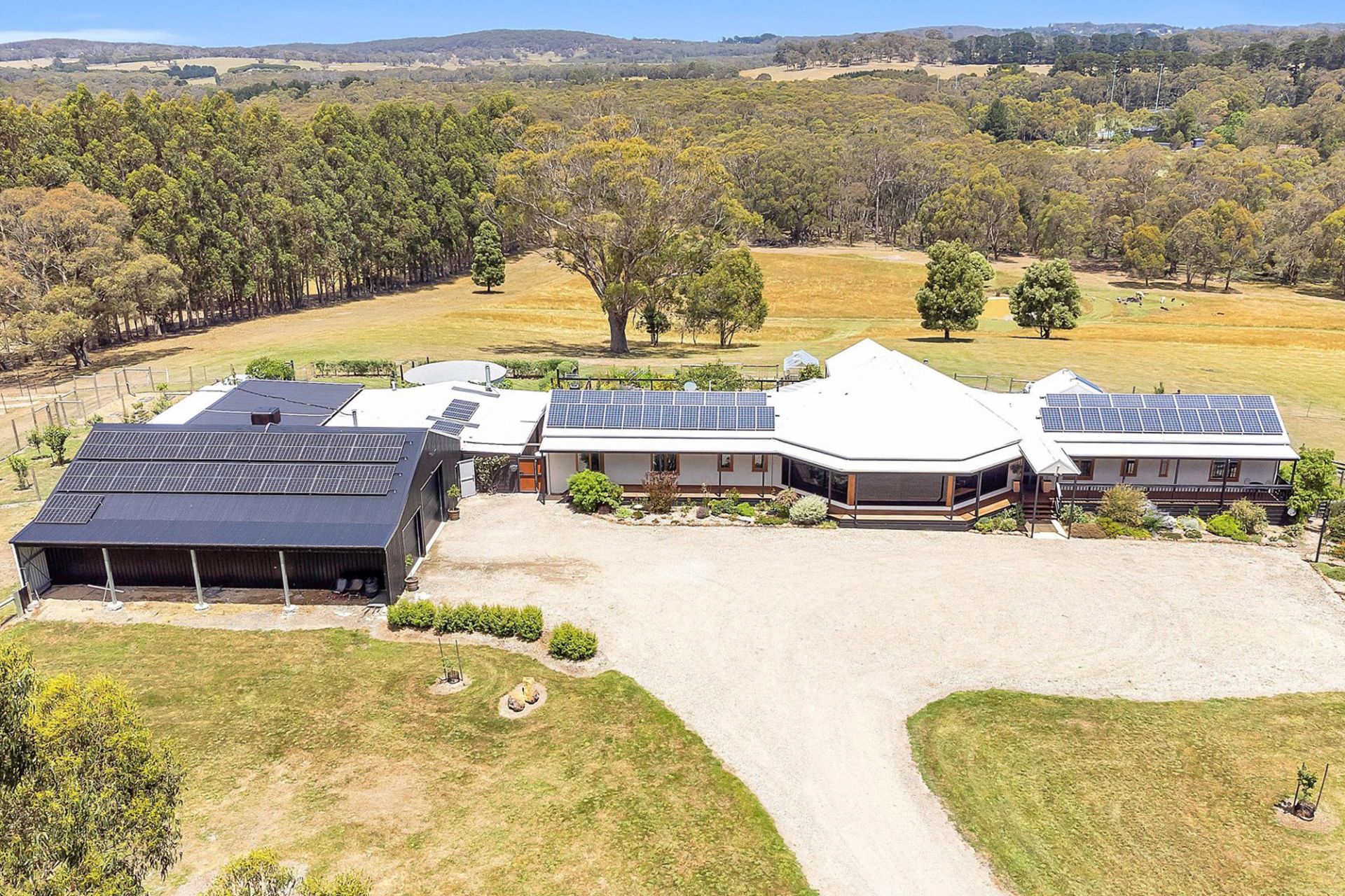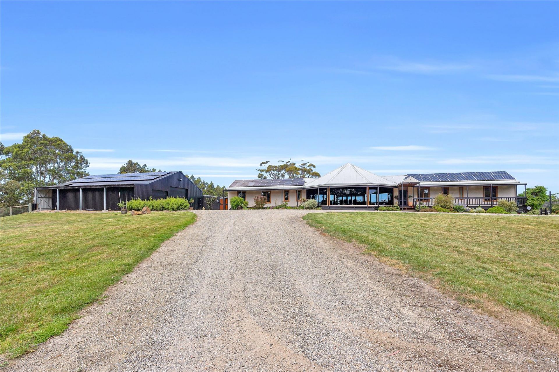 The home takes full advantage of its northerly aspect & features sustainable living with 26.4kW solar system, 25.5kW batteries, double glazing & 100,000-litre water tank with UV filtration. Designed for the discerning homeowner, the spacious floor plan includes an architectural living area at the heart of the home, surrounded by extensive shedding, ideal for a collector, tradesperson, or those needing secure storage for caravans, boats & more.