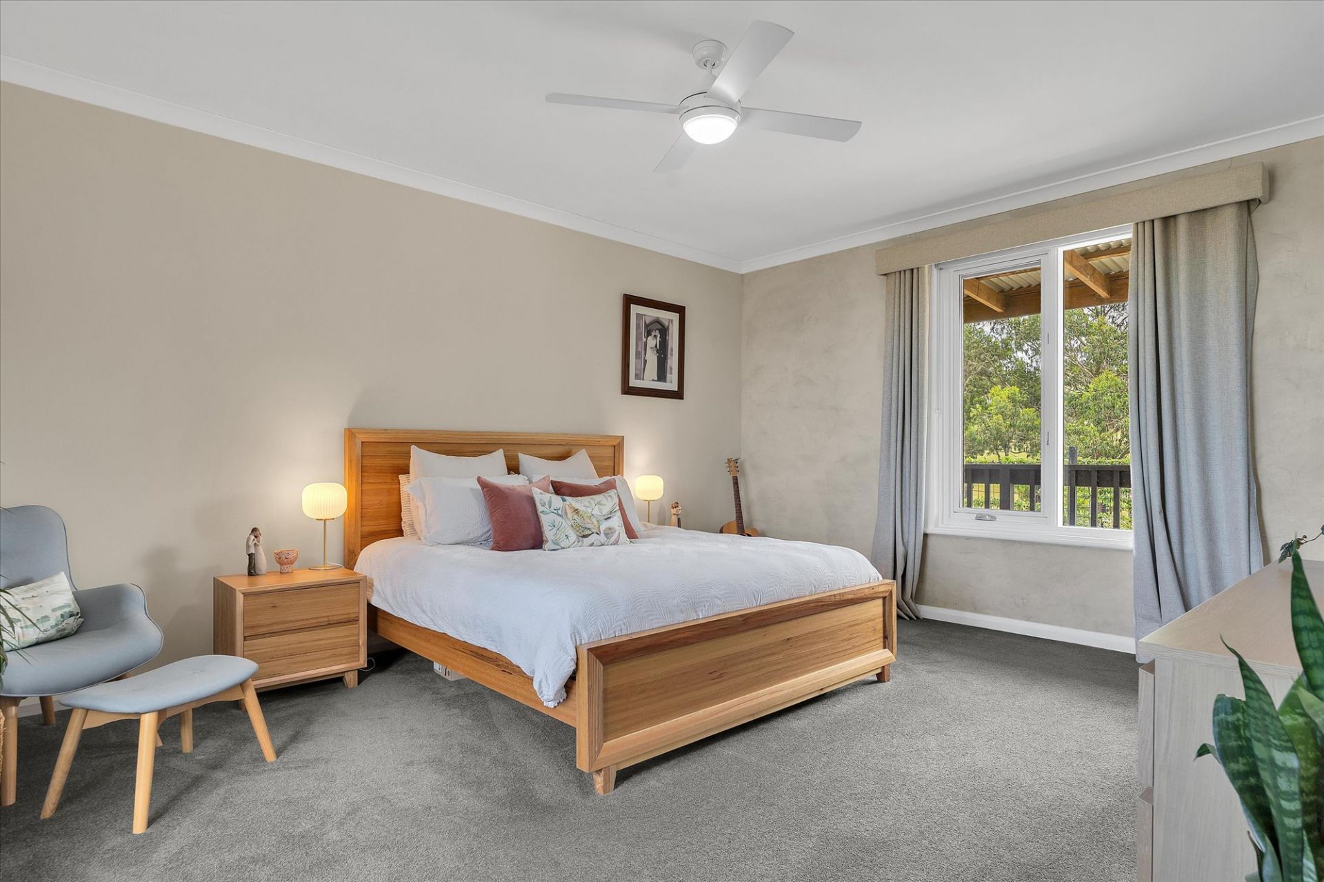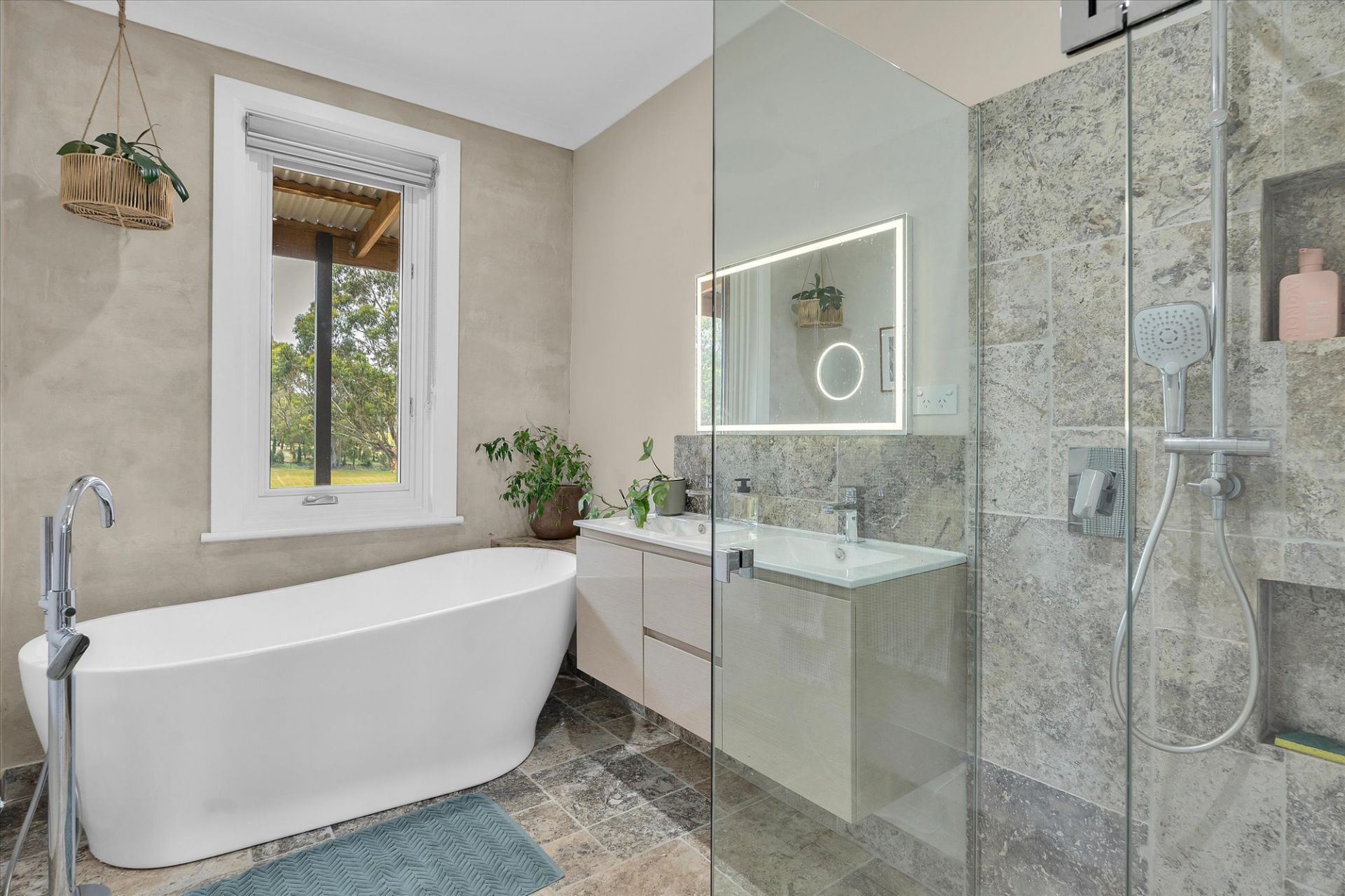 The west wing includes spacious master suite with walk-in robe & ensuite, featuring Travertine stone, underfloor heating, walk-in shower, heated towel rail & backlit mirrors. A second bedroom with BIR & direct access to outdoor decking & spa completes this wing. The east wing houses main bathroom with freestanding bath, dble vanity & walk-in shower, along with additional bedroom & large theatre room that can easily serve as a 4th bedroom/office.