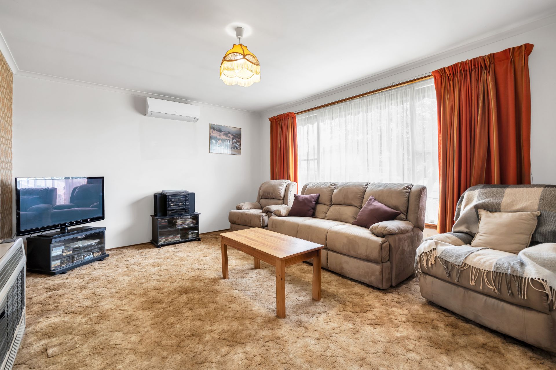 Light-filled living with gas wall heater and Fujitsu split system