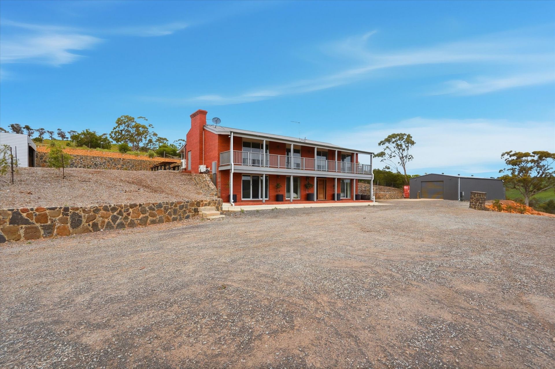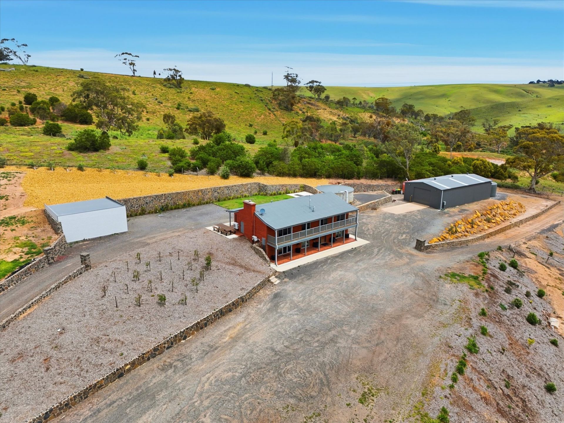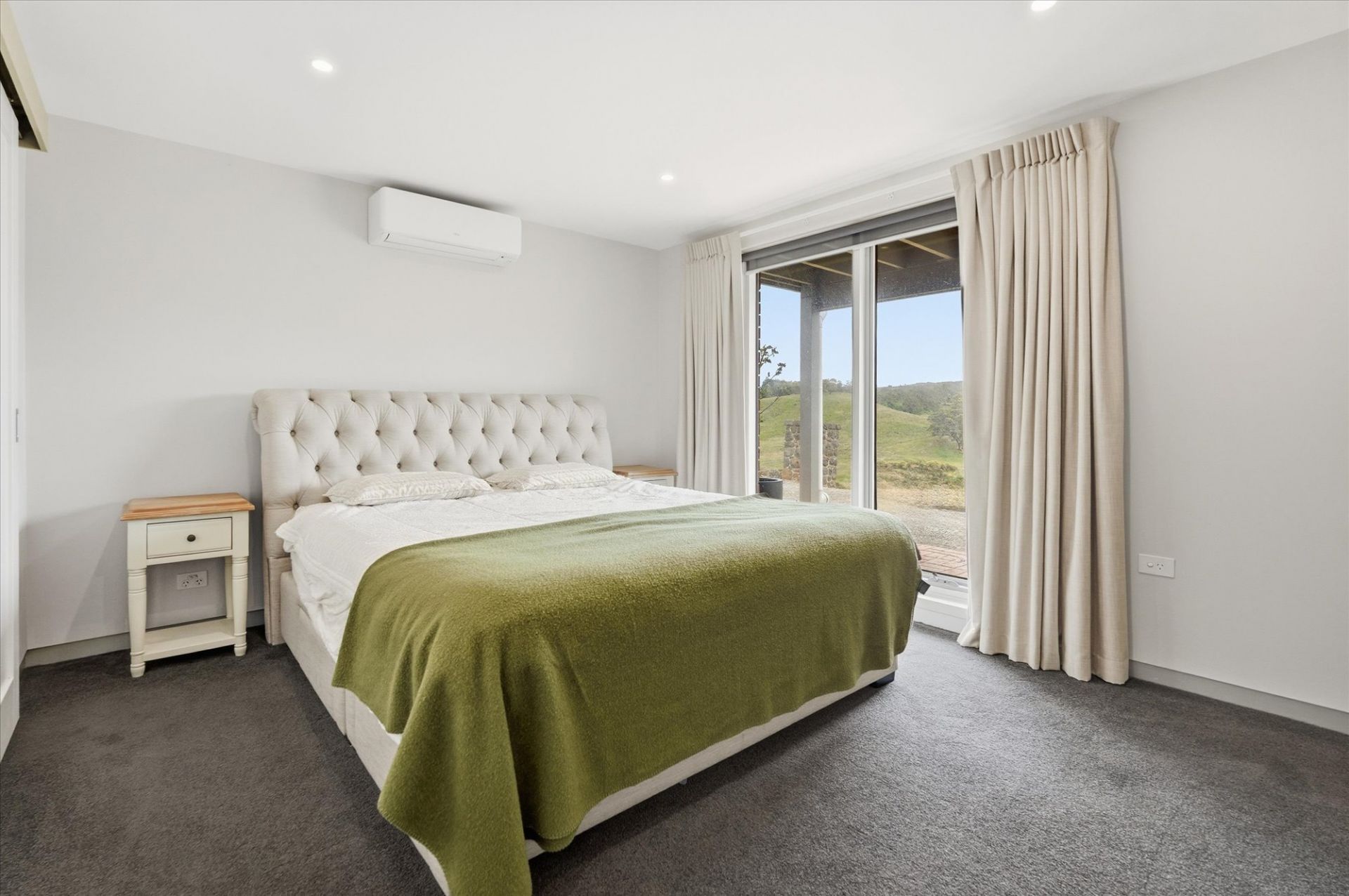 Designed to embrace its surroundings, the home captures spectacular views across the land and beyond. The ground floor reveals a warm and inviting master suite complete with walk-in robe and ensuite, alongside a second bedroom with built-in robes. A generous walk-in storage room provides scope for conversion to a home office, while the cosy living room with wood heater and an adjoining wine storage room create a charming, functional space.