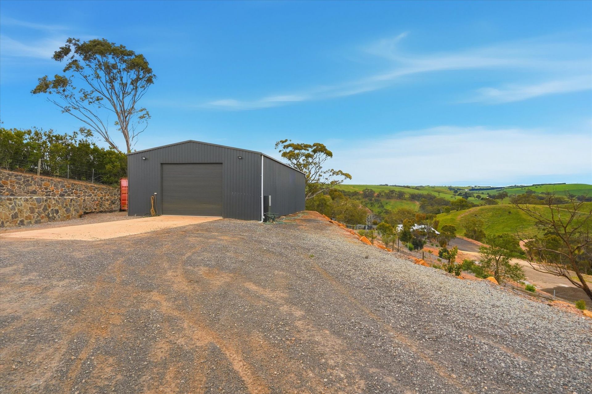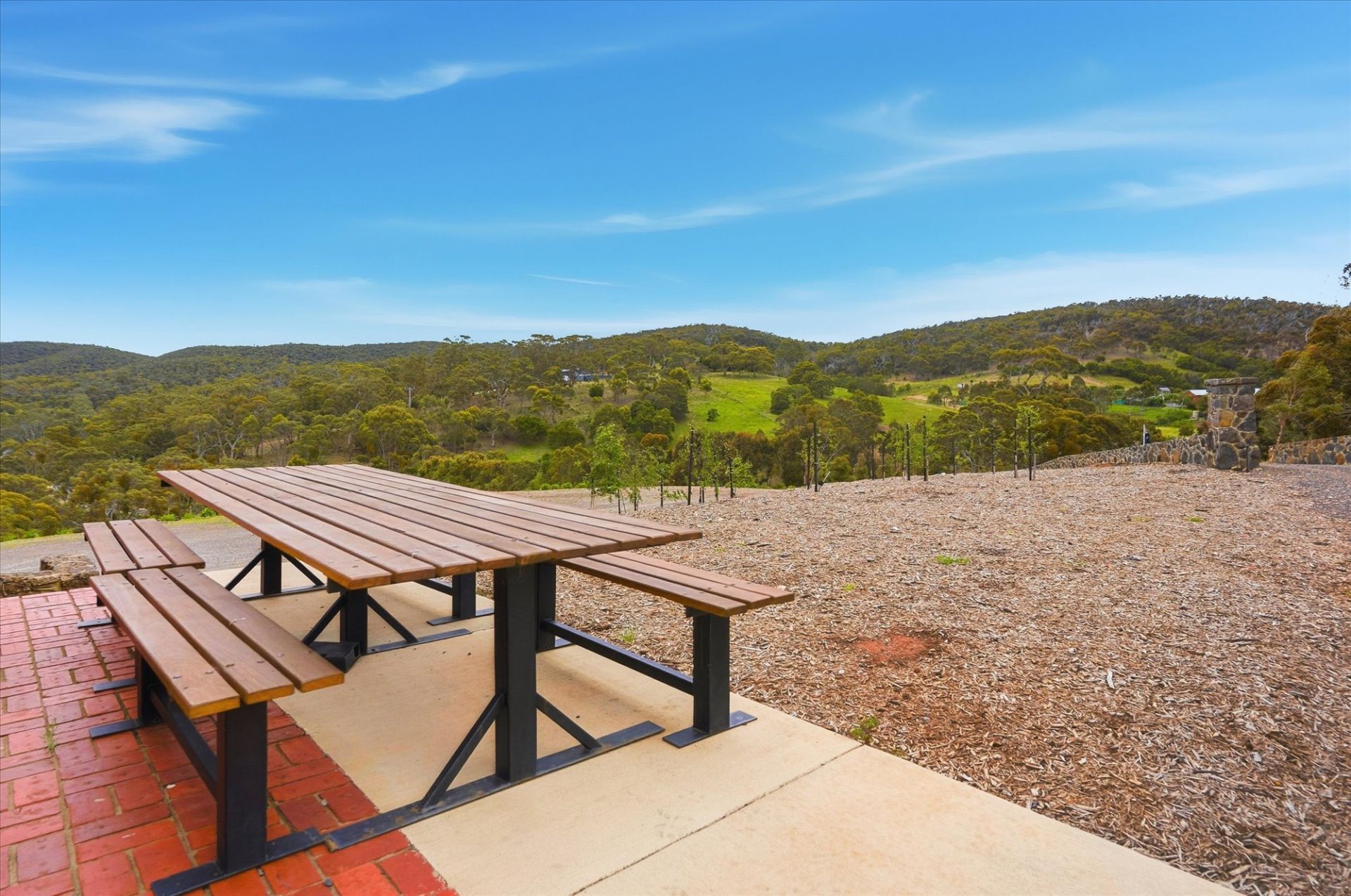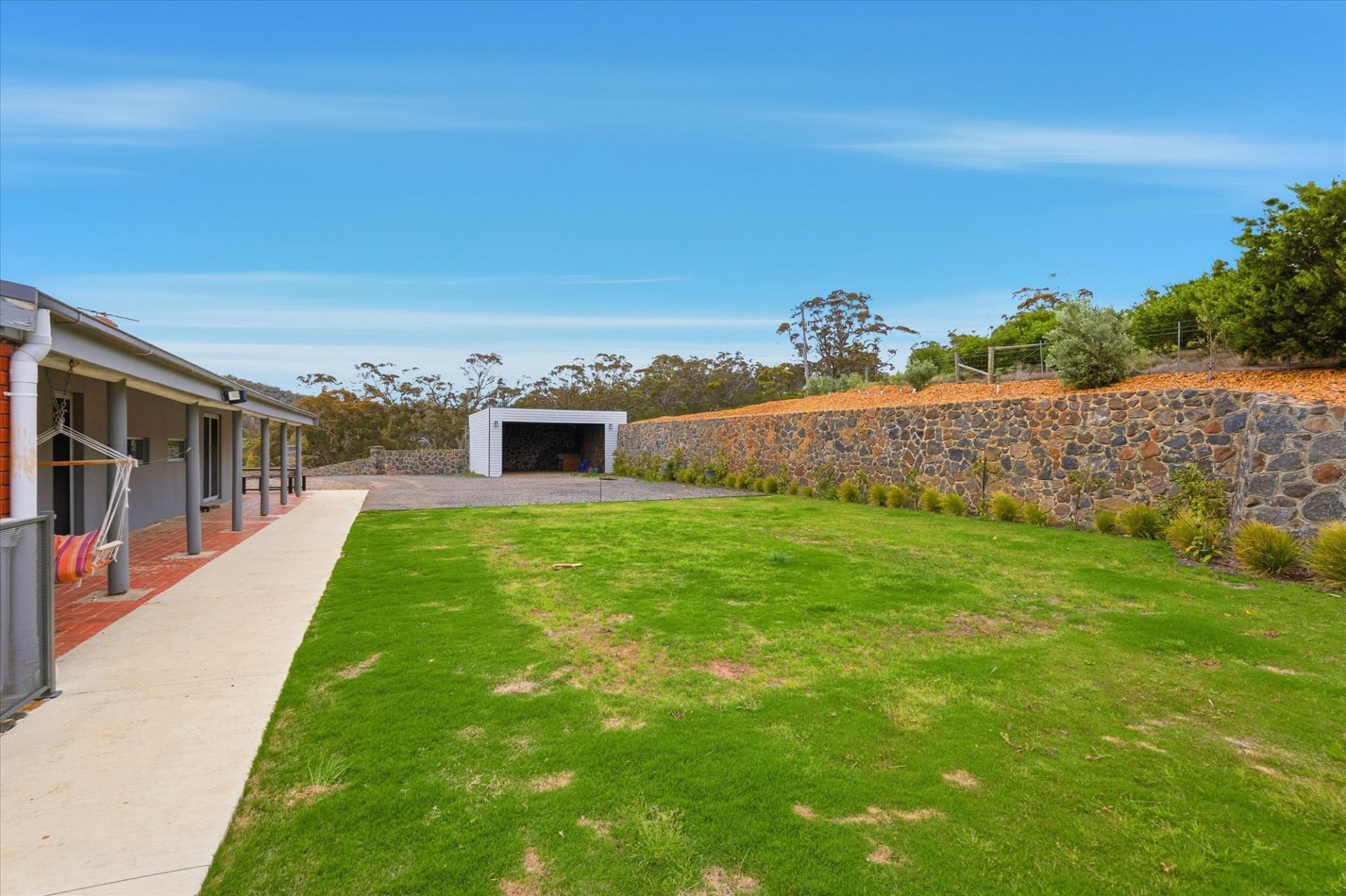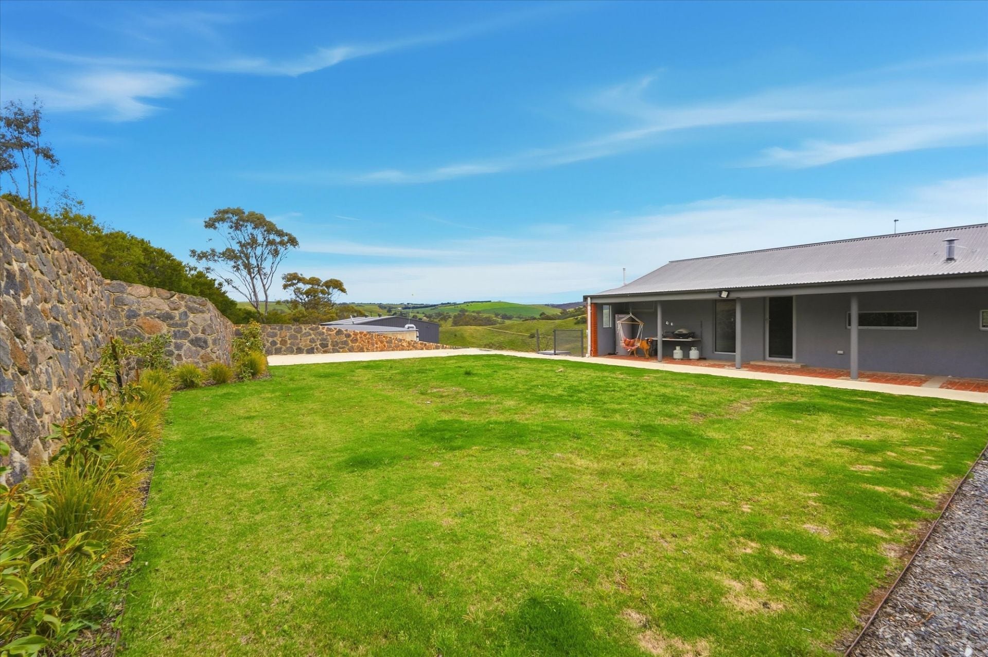 Designed to embrace its surroundings, the home captures spectacular views across the land and beyond. The ground floor reveals a warm and inviting master suite complete with walk-in robe and ensuite, alongside a second bedroom with built-in robes. A generous walk-in storage room provides scope for conversion to a home office, while the cosy living room with wood heater and an adjoining wine storage room create a charming, functional space.