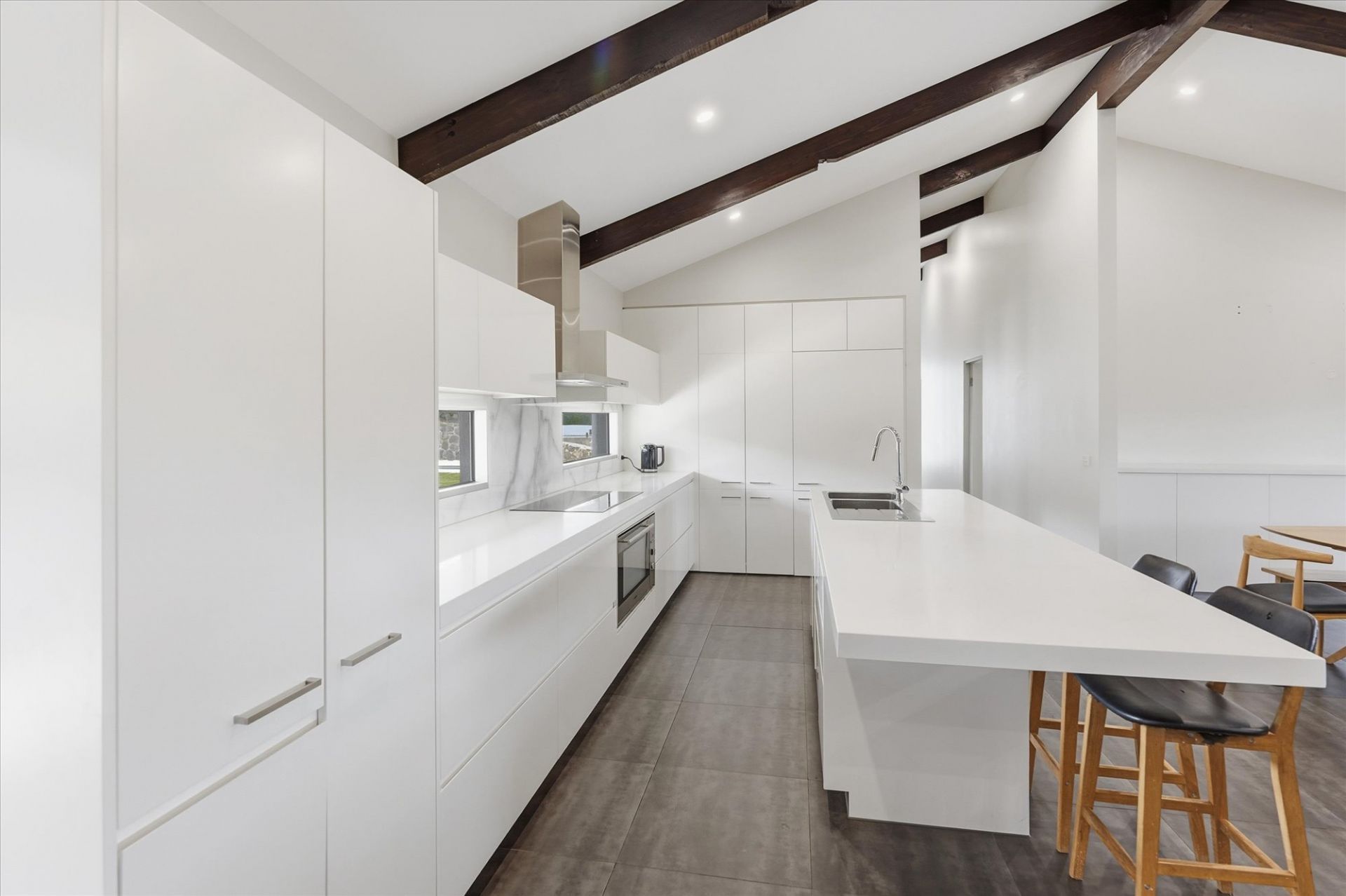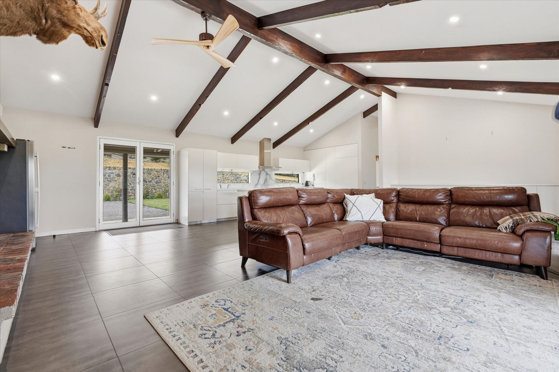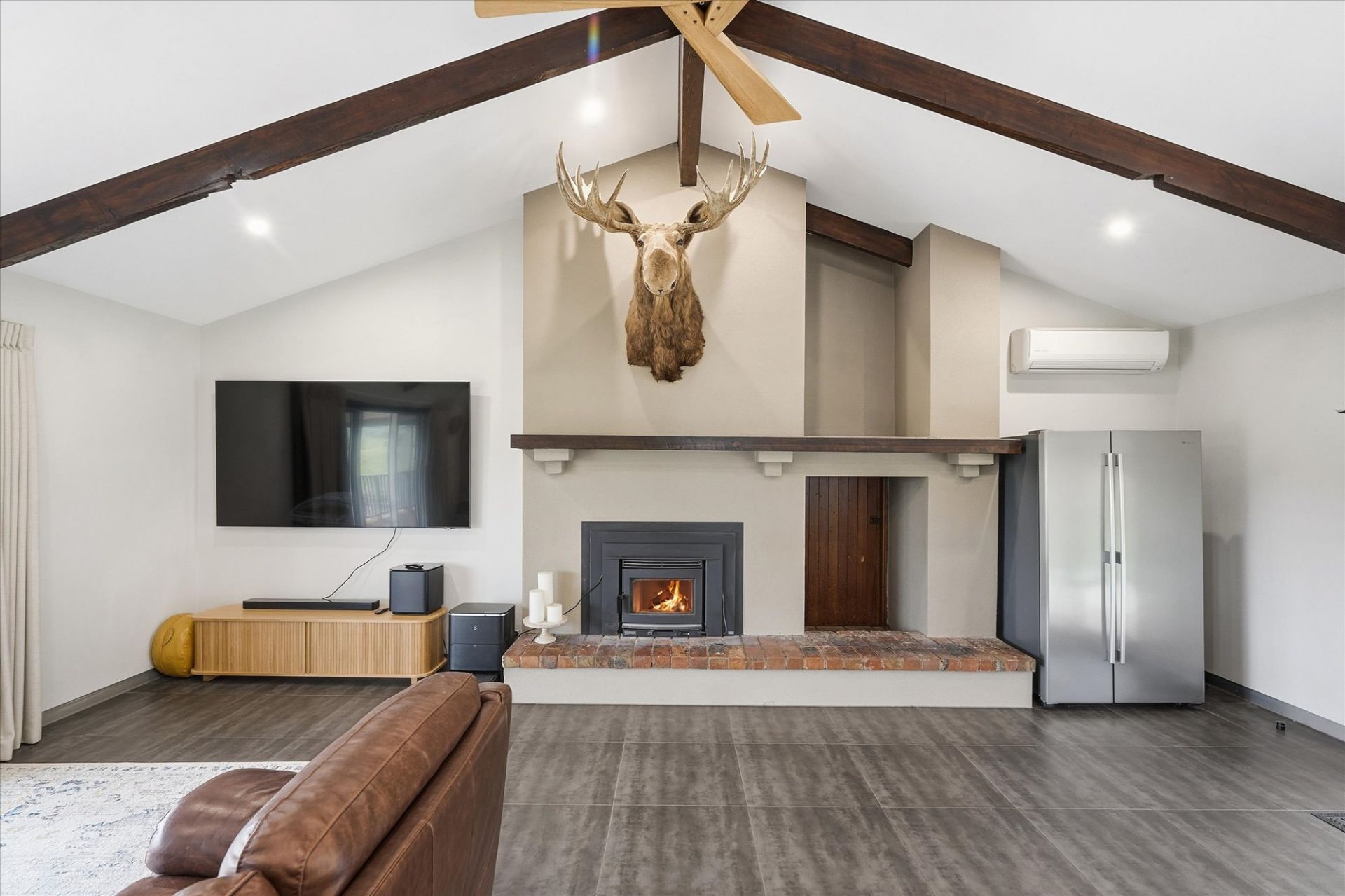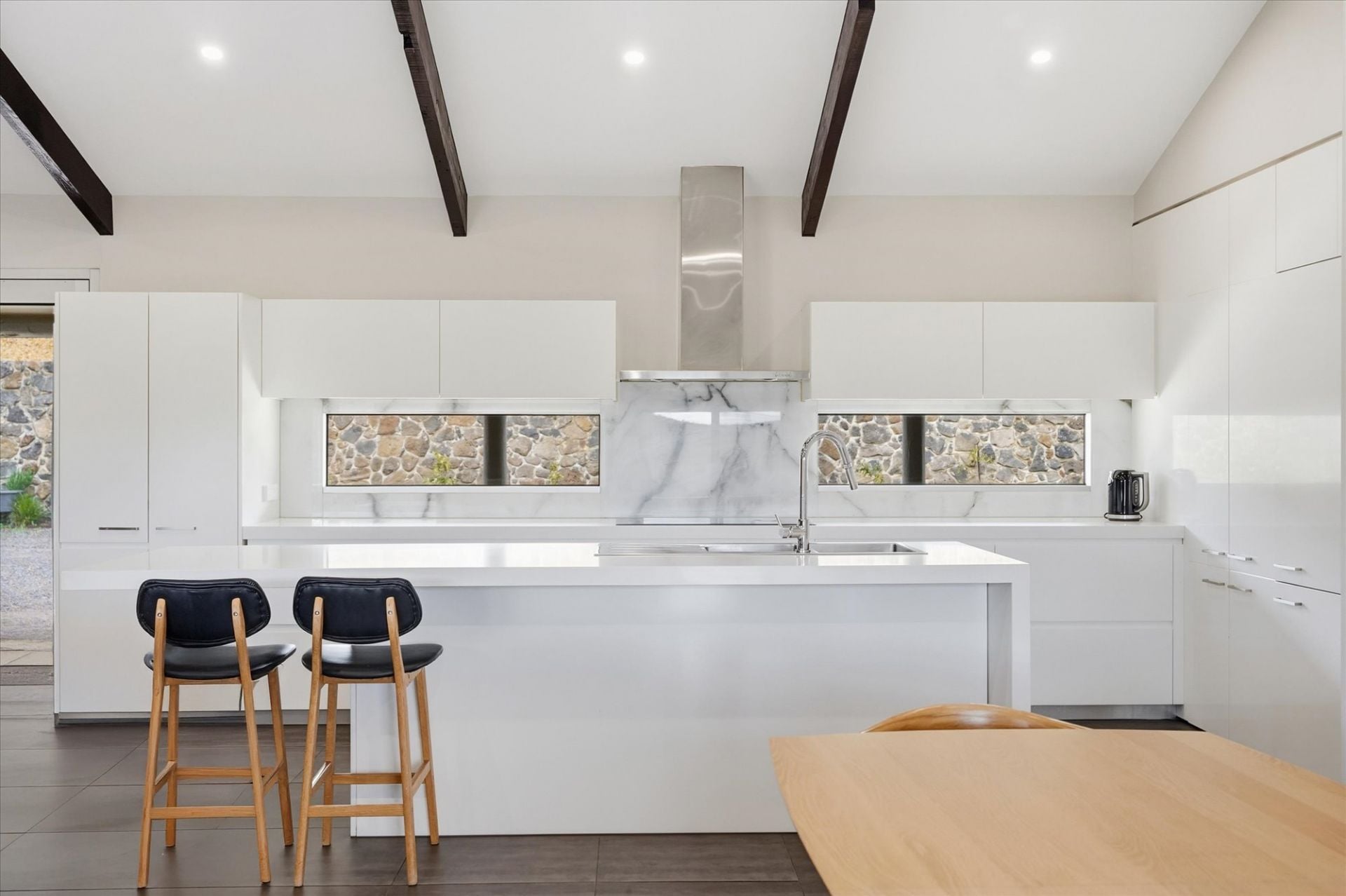A handcrafted hardwood staircase leads to the upper level, where soaring vaulted ceilings frame an expansive open-plan kitchen, meals and living zone. The kitchen showcases a waterfall benchtop, Blanco induction cooktop, Blanco oven, integrated fridge and integrated dishwasher-ensuring clean lines and effortless entertaining. A second wood heater enhances the ambience, while sliding doors open to a panoramic balcony overlooking the undulating countryside.