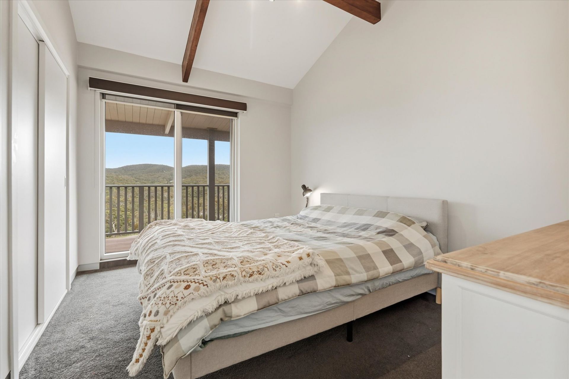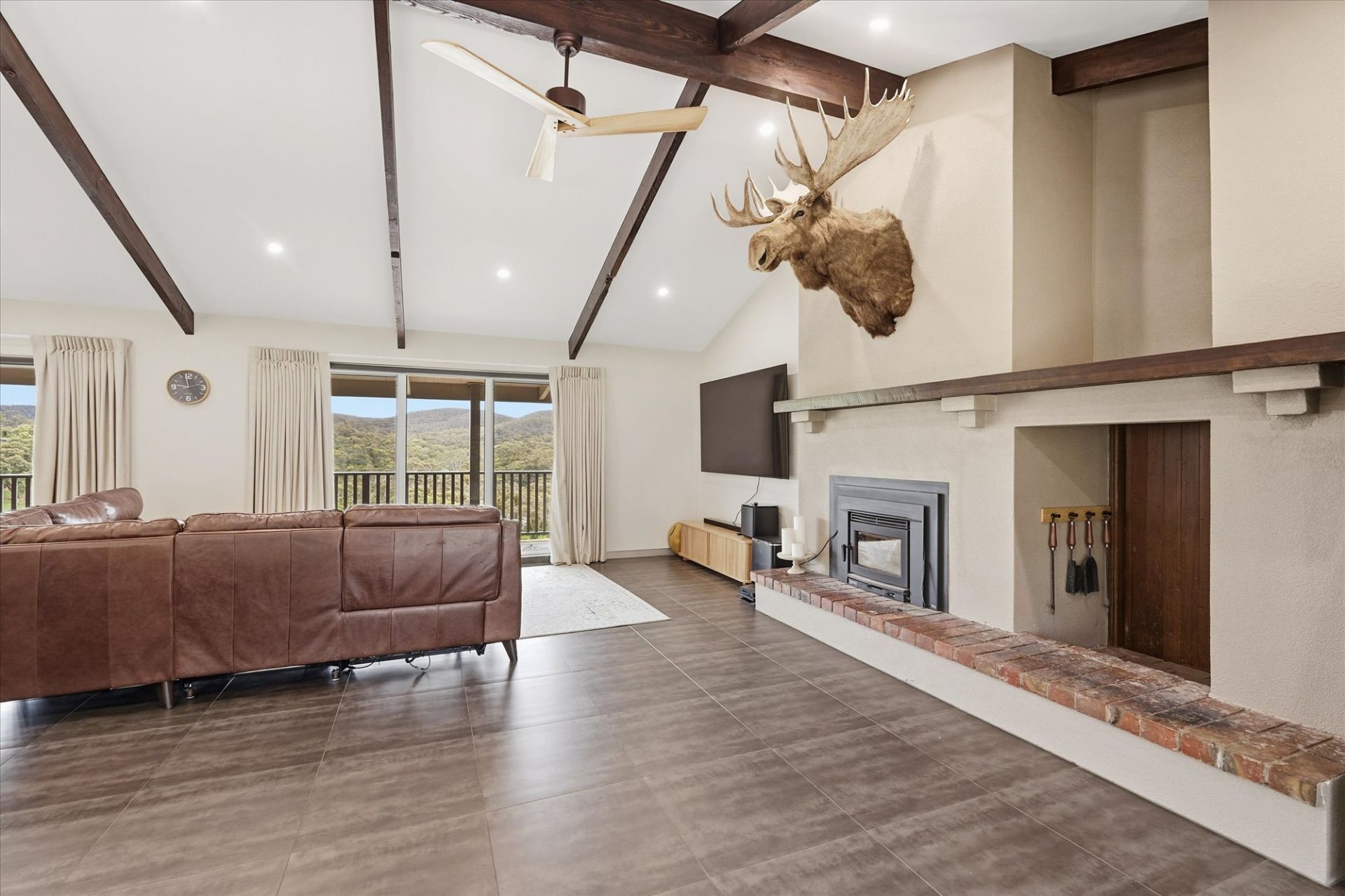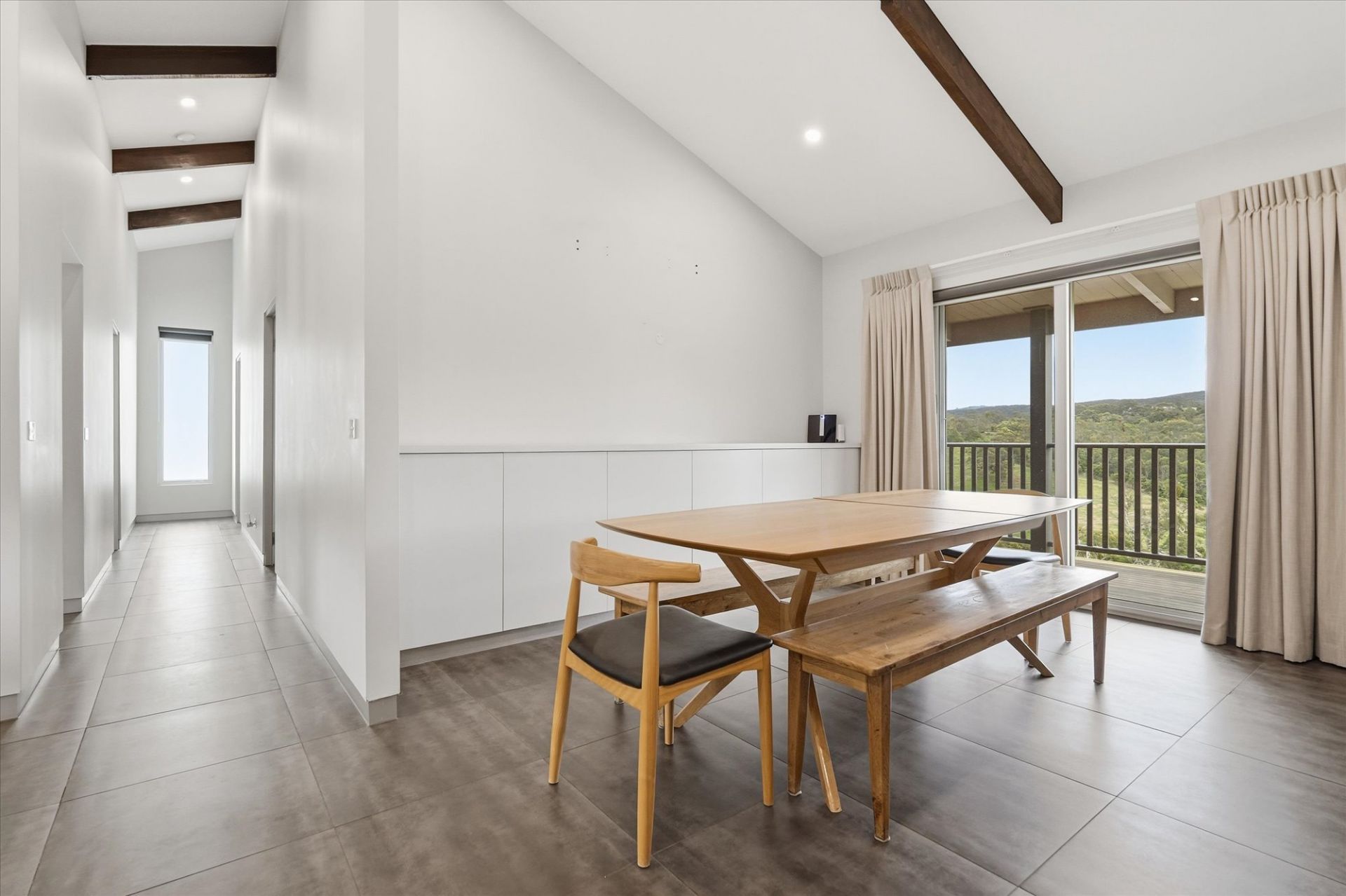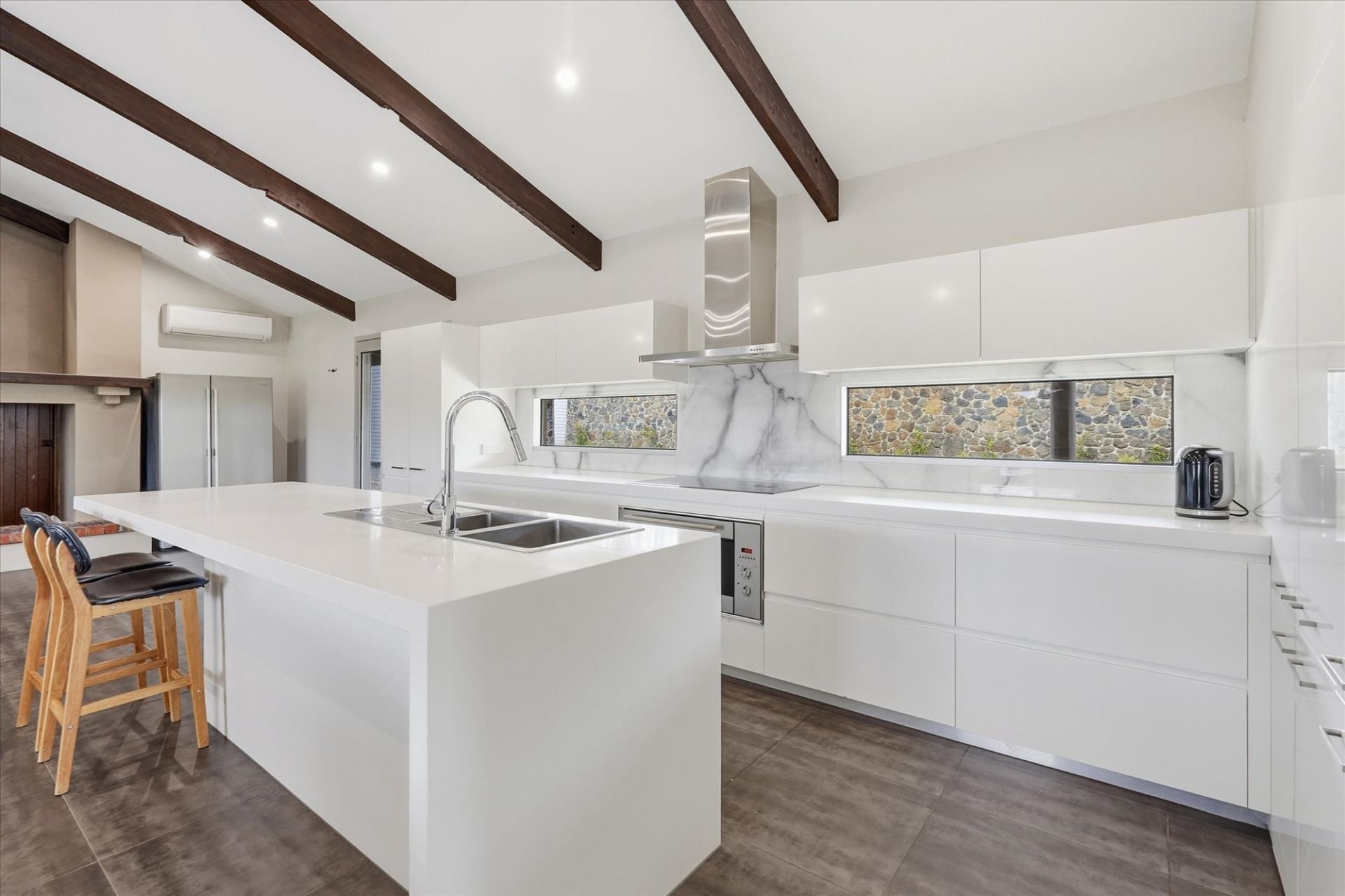 A handcrafted hardwood staircase leads to the upper level, where soaring vaulted ceilings frame an expansive open-plan kitchen, meals and living zone. The kitchen showcases a waterfall benchtop, Blanco induction cooktop, Blanco oven, integrated fridge and integrated dishwasher-ensuring clean lines and effortless entertaining. A second wood heater enhances the ambience, while sliding doors open to a panoramic balcony overlooking the undulating countryside.