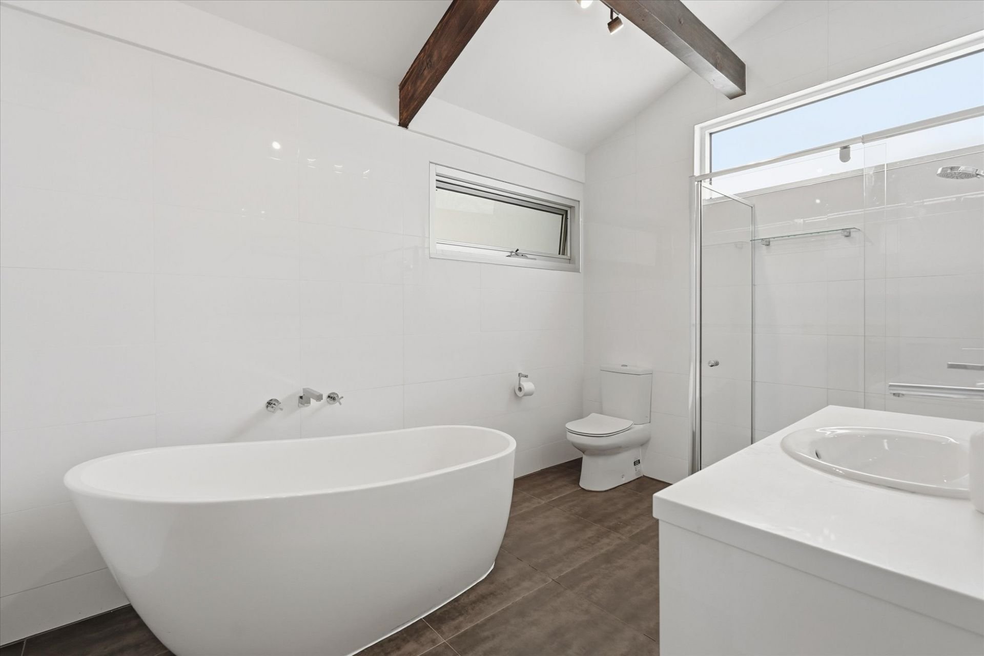 Completing the upper level are two additional bedrooms, each with built-in robes, and a light-filled main bathroom featuring a freestanding bath. Comfort is assured year-round with split systems installed in all bedrooms and both living areas.