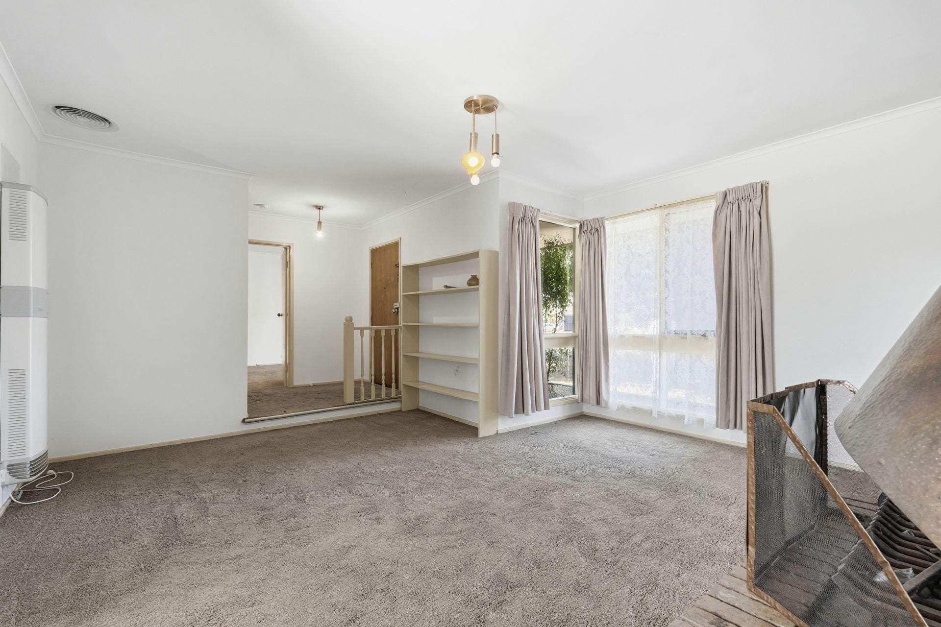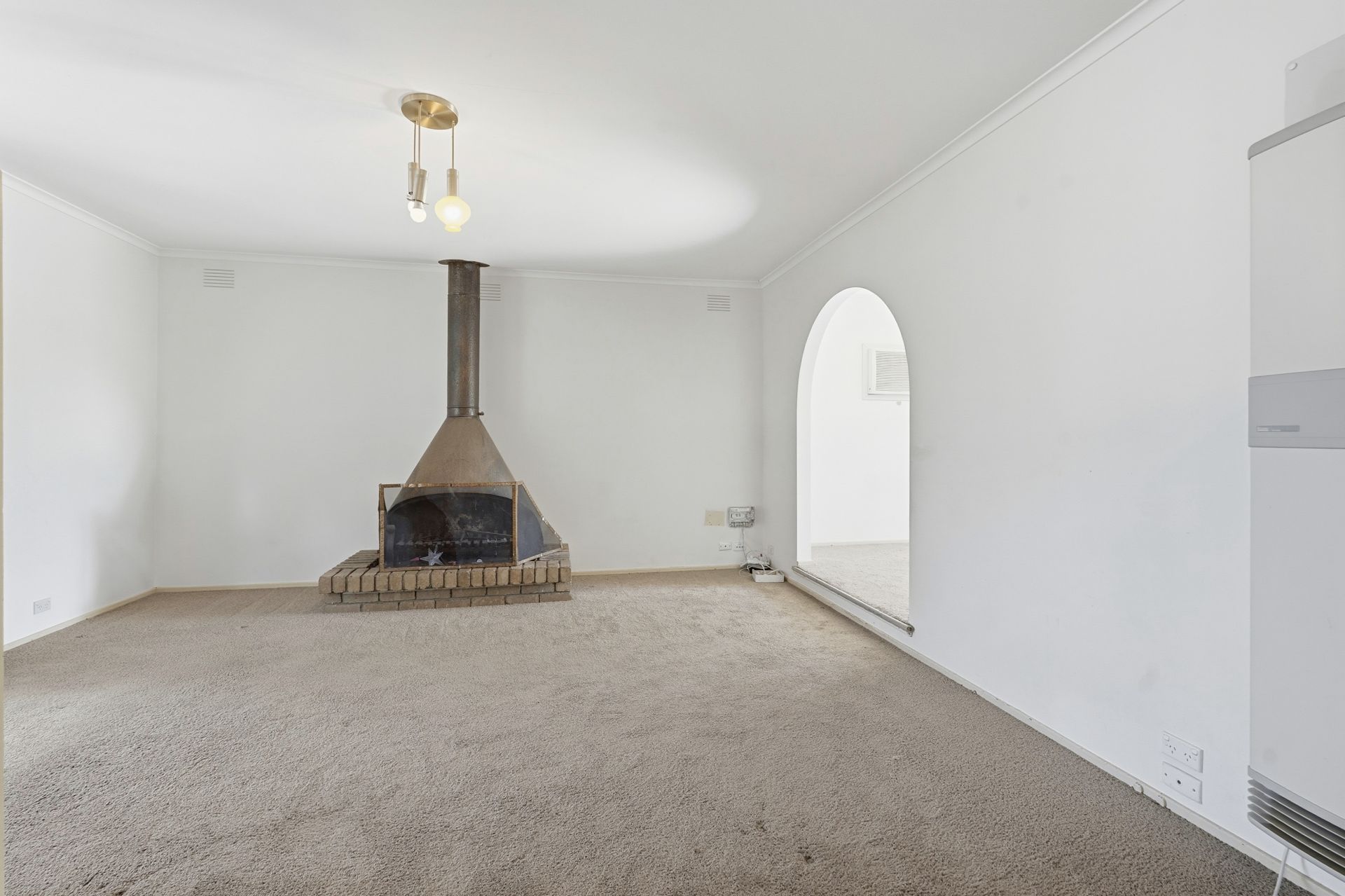 The floorplan comprises three bedrooms, with the main featuring a walk-in robe and direct access to the central bathroom, while the remaining two bedrooms include built-in robes. A sunken lounge is positioned at the front of the home and includes a gas wall heater and air-conditioning (open fireplace not in use).