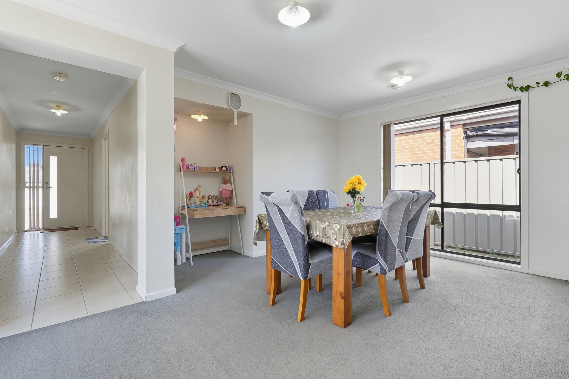 The master bedroom features a walk-in robe and private ensuite complete with shower, vanity, and toilet, while the remaining bedrooms are fitted with built-in robes and serviced by a central bathroom with bath, shower, and vanity. At the heart of the home, the open-plan living and dining area is complemented by a well-appointed kitchen boasting a dishwasher, 600mm oven, gas cooktop, wine storage, glass window splashback, and plenty of cupboard space. A study nook off the dining area provides the perfect spot for working or studying from home.