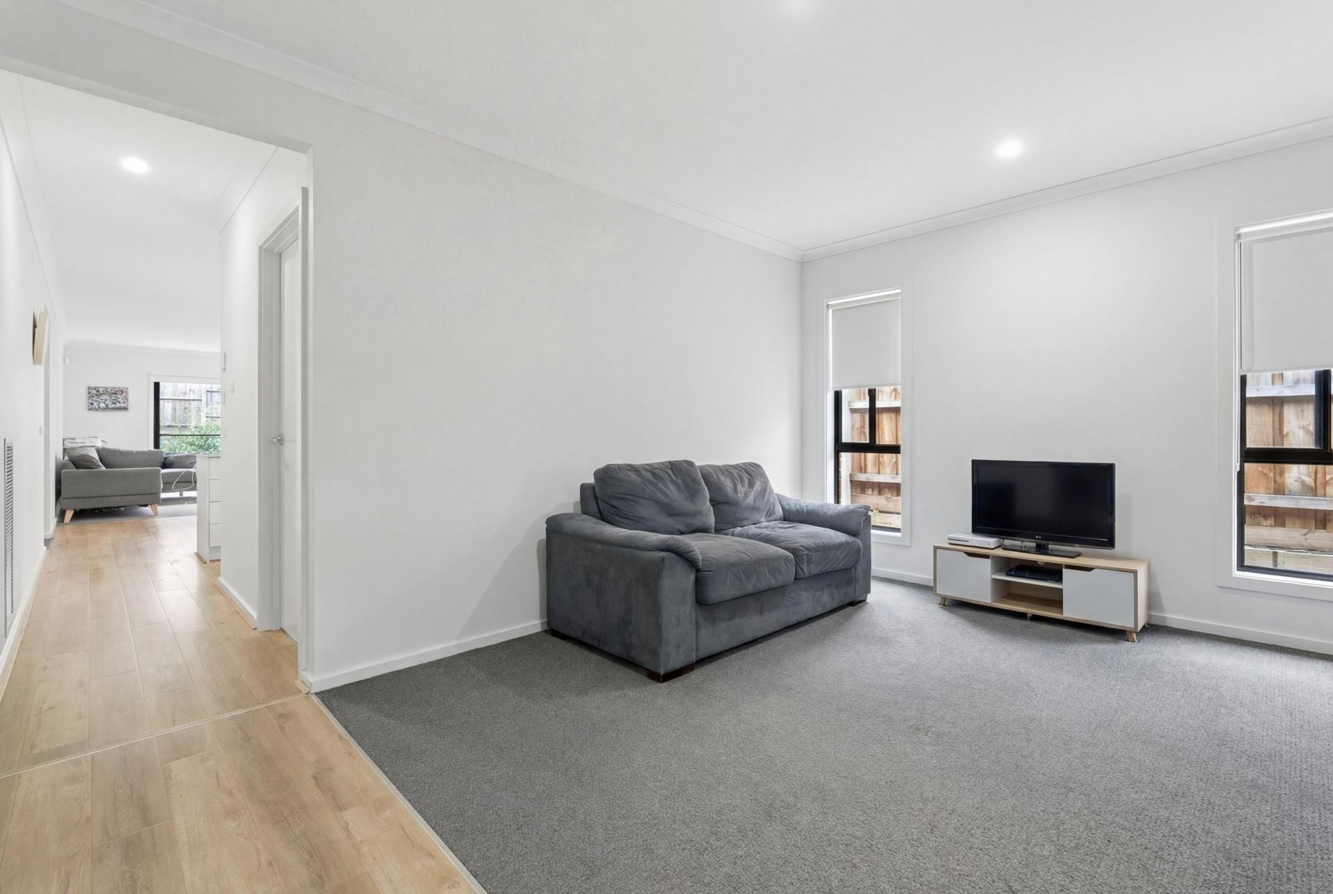 At the heart of the home is the open plan kitchen and meals area, equipped with a dishwasher and flowing seamlessly into the main living space. A second carpeted living area provides flexibility for families, whether as a lounge, media room, or kids' retreat.